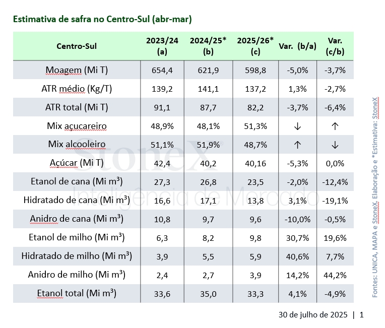 Relatório sobre as estimativas de safra para a região da StoneX, empresa global de serviços financeiros, aponta que a safra 2025/26 de cana-de-açúcar no Centro-Sul do Brasil deve alcançar 598,8 milhões de toneladas, volume 3,7% inferior ao processado na temporada anterior. A queda seria devido ao tempo mais seco durante o período de desenvolvimento da safra, assim como o impacto das queimadas em 2024. Além da menor moagem, condições climáticas atípicas nos primeiros meses do ciclo, com chuvas acima da média histórica em junho e menores números de acompanhamento levam a uma revisão para baixo na qualidade da matéria-prima, medida pelo Açúcar Total Recuperado (ATR), que já acumula retração de 4,8% até o fim de junho.